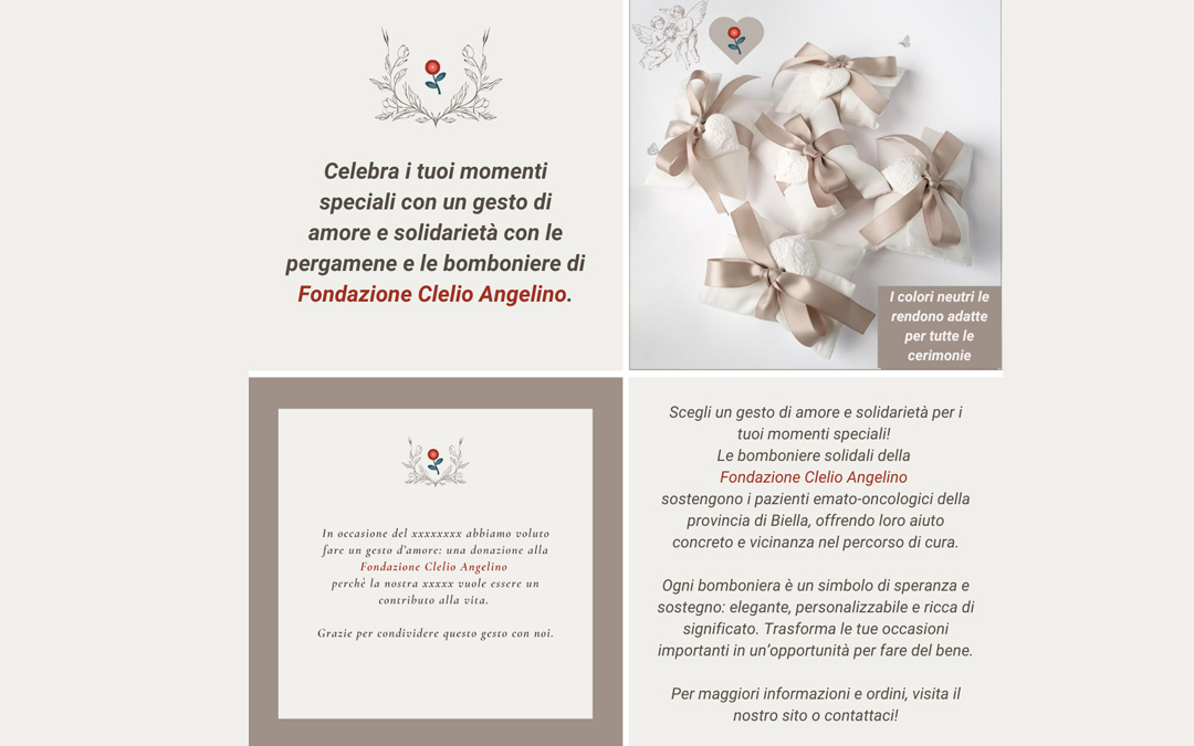 Scegliendo le bomboniere e le pergamene solidali della Fondazione Clelio Angelino, compi un gesto di grande valore: il tuo contributo aiuterà i pazienti emato-oncologici della provincia di Biella, offrendo loro supporto e speranza nel percorso di cura.