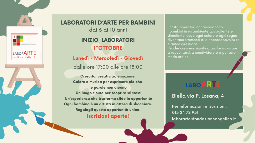 La Fondazione Clelio Angelino, con il sostegno della Fondazione Zegna, apre le iscrizioni a LaborARTE, il laboratorio creativo dedicato ai bambini dai 6 ai 10 anni.
